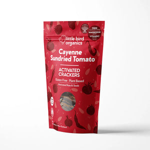 Little Bird Cayenne Sundried Tomato Almond Crackers are made with activated almonds and golden flax seeds, blended together with sundried tomatoes and Mexican inspired spices to create an exceptionally tasty savoury snack. These little crackers are naturally packed with organic goodness, including an abundance of Omega 3’s, and containing Vitamin E, B Vitamins and Magnesium.