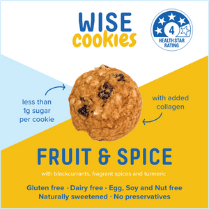 These delicious 4.0 Health Star rated cookies combine the goodness of blackcurrants, collagen and turmeric into a fruity mouthful that's fragrant and delicious. Think hot cross buns, Christmas mince pies or tasty fruit loaf - only better!